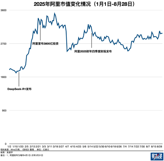 2025年以来(1月1日-8月27日),阿里纽交所股价已上涨44%。截至8月28日,阿里收盘价120美元,总市值2896亿美元。