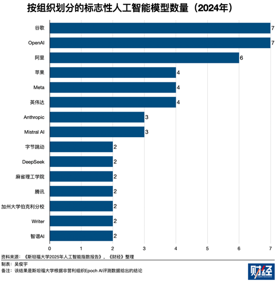 斯坦福大学的《人工智能指数报告2025》指出,阿里标志性人工智能模型数量有六个,位居全球第三,在谷歌和OpenAI之后。