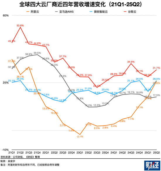 靠着初步的AI红利,阿里云摆脱了过去三年的低迷期。2025上半年,阿里云营收635亿元,同比增长21.8%。2025年二季度,阿里云几乎追平了全球云计算领头羊微软智能云的营收增速。